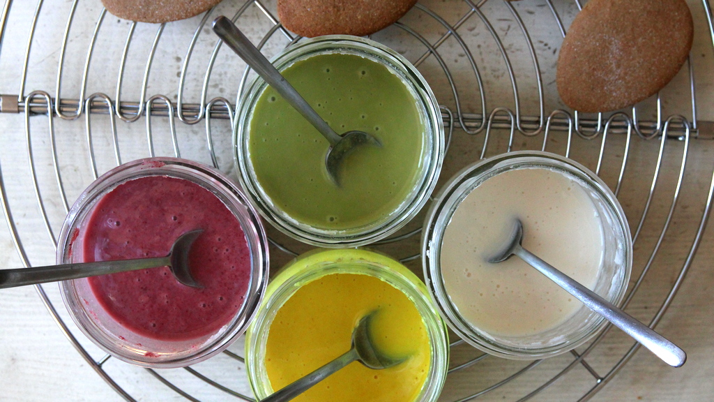 Barvit se dá samozřejmě i spoustou dalších věcí... Stejně jako je k dostání prášek ze sušené řepy, existuje i špenátová sytě zelená varianta. Pak je tu třeba kakao a v poslední době se objevily (zatím bohužel ne u nás) i různě barevné varianty matcha čaje. Všechny jsou barvené přirozeně různými kytičkma, takže naprostá nádhera :-)
