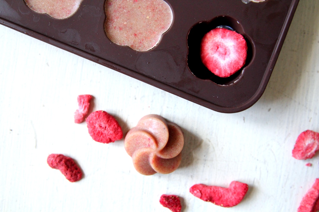 Když jsem experimentovala s verzí ve formičkách, přišlo mi lepší jahody taky trochu pomixovat, aby se v jednotlivých bonbónech rovnoměrně rozprostřely.
