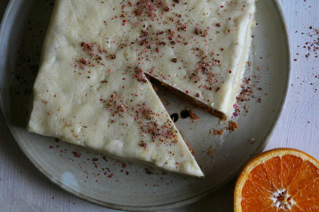 Na polevu/krém rozmixujte kokos až do konzistence kokosového másla (o tom třeba příště). Přidejte pomerančovou šťávu, javorový sirup nebo jiné tekuté sladidlo a je hotovo. Raději neochutnávejte, jinak vám nic nezbyde na potření dortu :-) Kokos je sladký sám o sobě, ale pokud do polevy nepřidáte ještě jiné sladidlo, ztuhne v lednici tak, že se při krájení bude lámat.